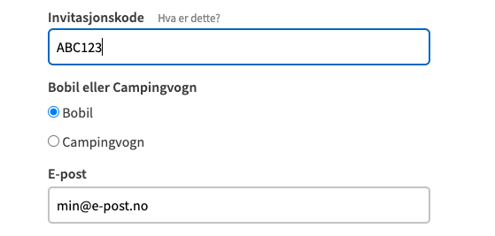 Skjemaet vil være ferdig utfylt med e-postadresse og en invitasjonskode. Som vert skal du krysse av for Bobil, og i feltet for Bilnummer kan du som vert skrive noe vilkårlig.